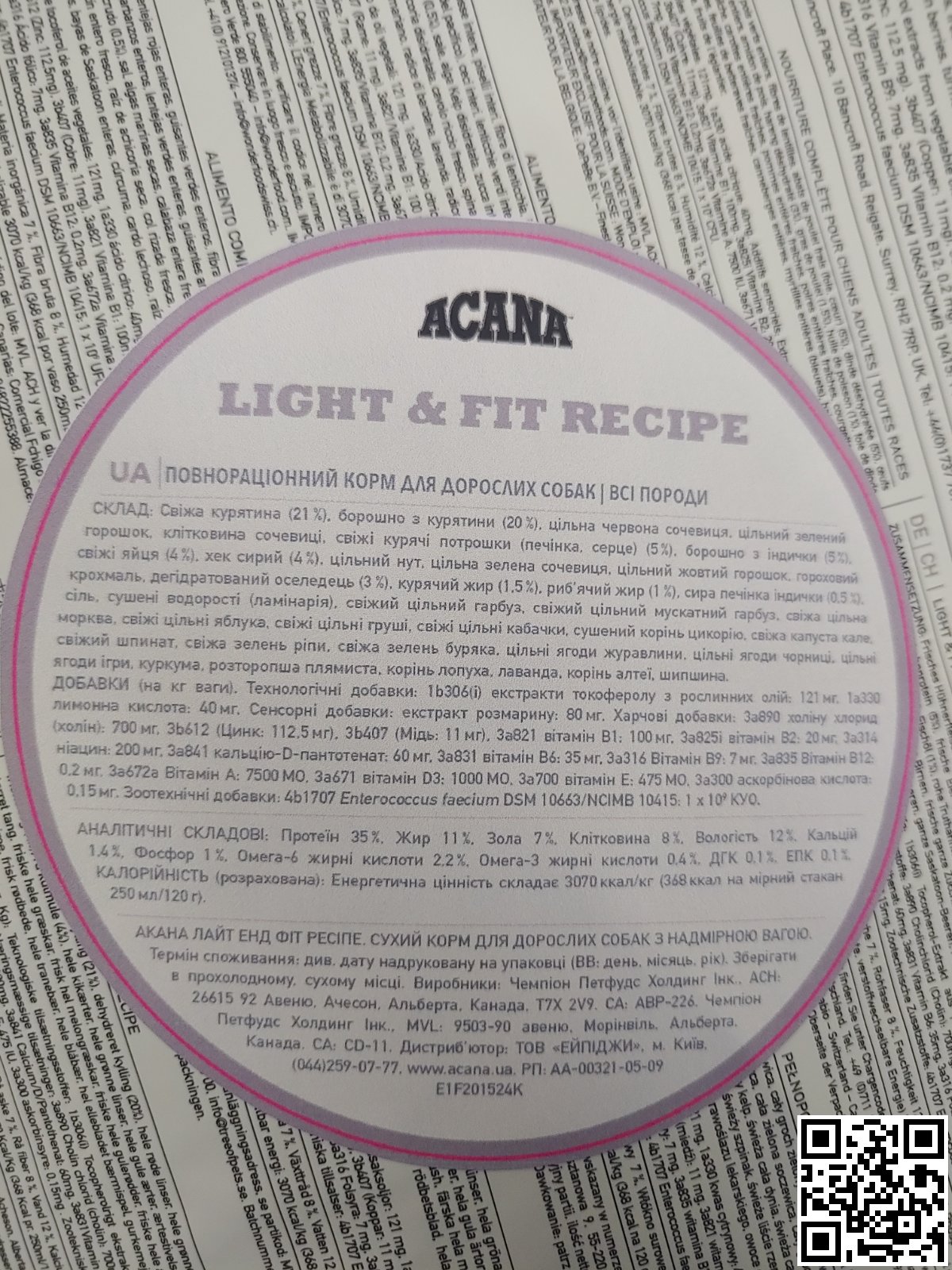 Фото строків придатності acana-lightfit-recipe-20-kg, зроблене 2025-12-30 place Спожити до