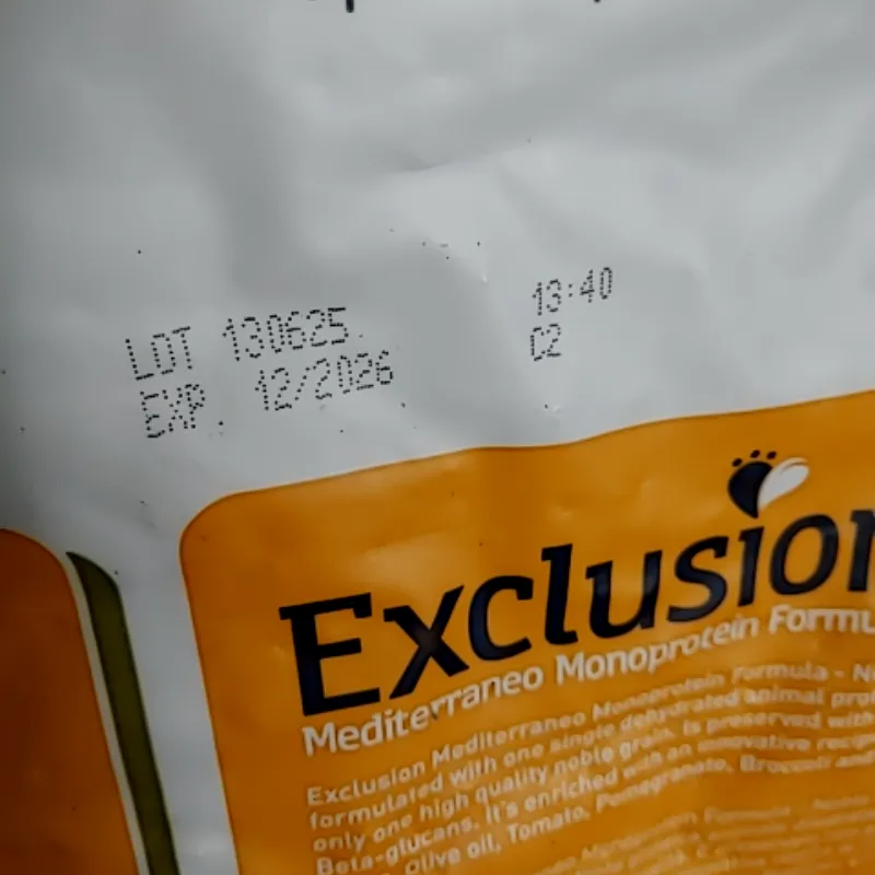 Exclusion Mediterraneo Monoprotein Formula – повнораціонний збалансований корм на основі високоякісного зерна та дегідрованого монопротеїну тваринного походження. Містить тільки натуральні антиоксиданти та β-глюкани. Рецептура корму розроблена в кращих середземноморських традиціях та включає в себе коноплі, оливкову олію, помідори, гранат, броколі та цикорій.