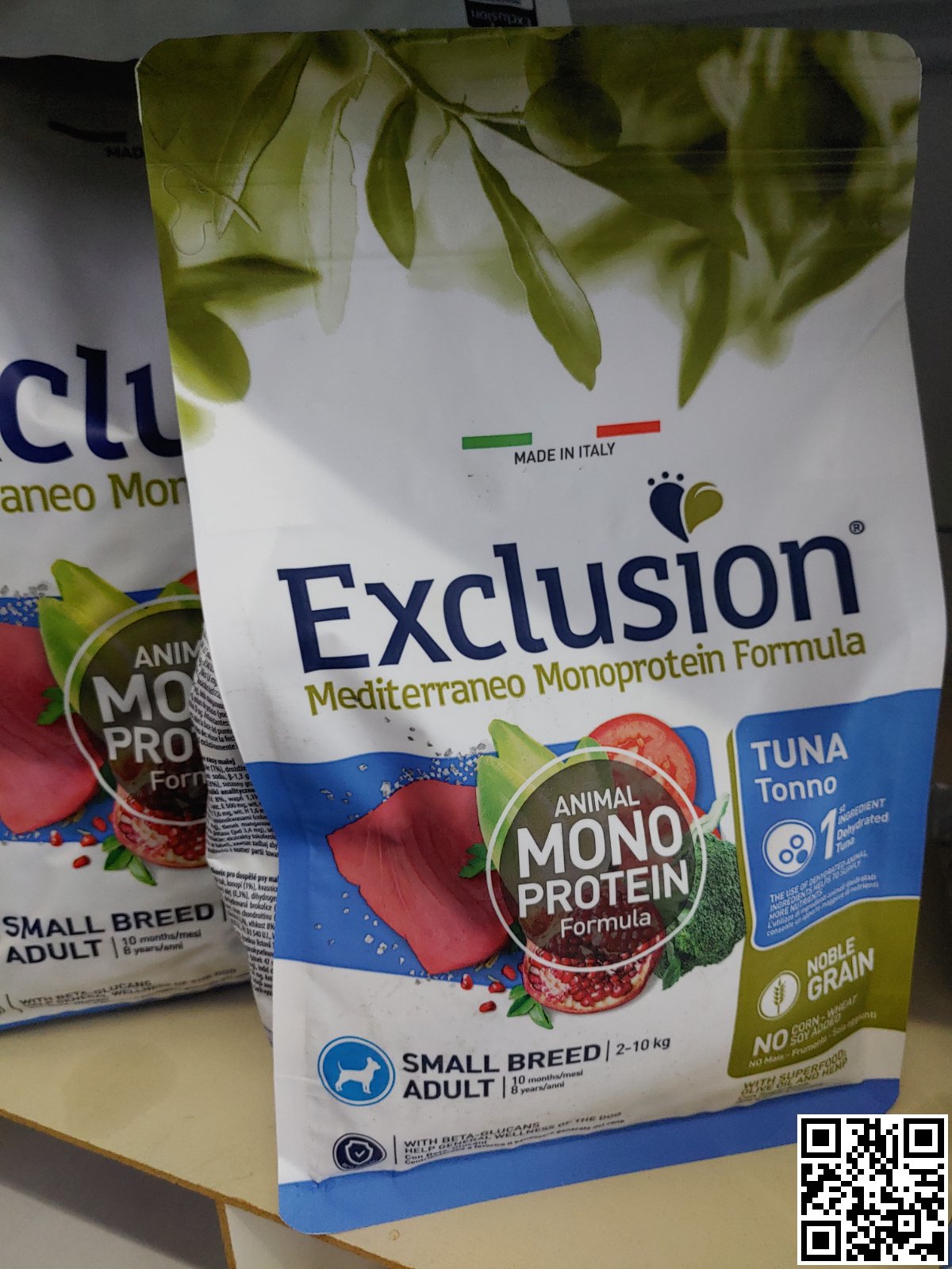 Exclusion Mediterraneo Monoprotein Formula – повнораціонний збалансований корм на основі високоякісного зерна та дегідрованого монопротеїну тваринного походження. Містить тільки натуральні антиоксиданти та β-глюкани. Рецептура корму розроблена в кращих середземноморських традиціях та включає в себе коноплі, оливкову олію, помідори, гранат, броколі та цикорій.