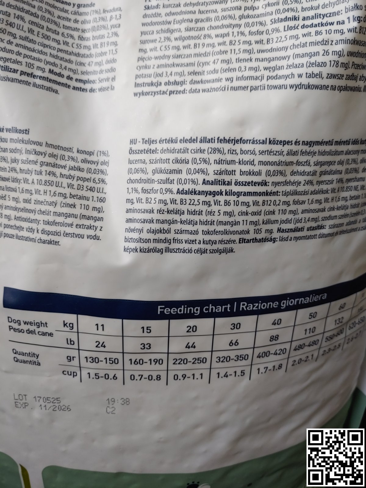 Дегідроване м'ясо курки (28%), рис, горох, свинячий жир, гідролізований протеїн тваринного походження з низькою молекулярною масою, коноплі (1%), дріжджі, дегідрована люцерна, сушена м’якоть цикорію (0,5%), хлорид натрію, мононатрію фосфат, олія рижію (0,3%), оливкова олія (0,3%), β-1,3 глюкани з водоростей Euglena gracilis (0,06%), глюкозамін (0,04%), дегідрована броколі (0,03%), дегідрований гранат (0,03%), дегідрований томат (0,03%), юка моджаве, хондроїтину сульфат (0,01%)