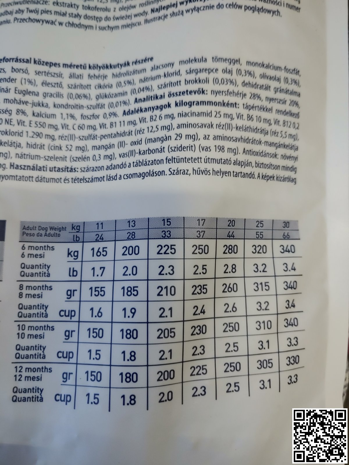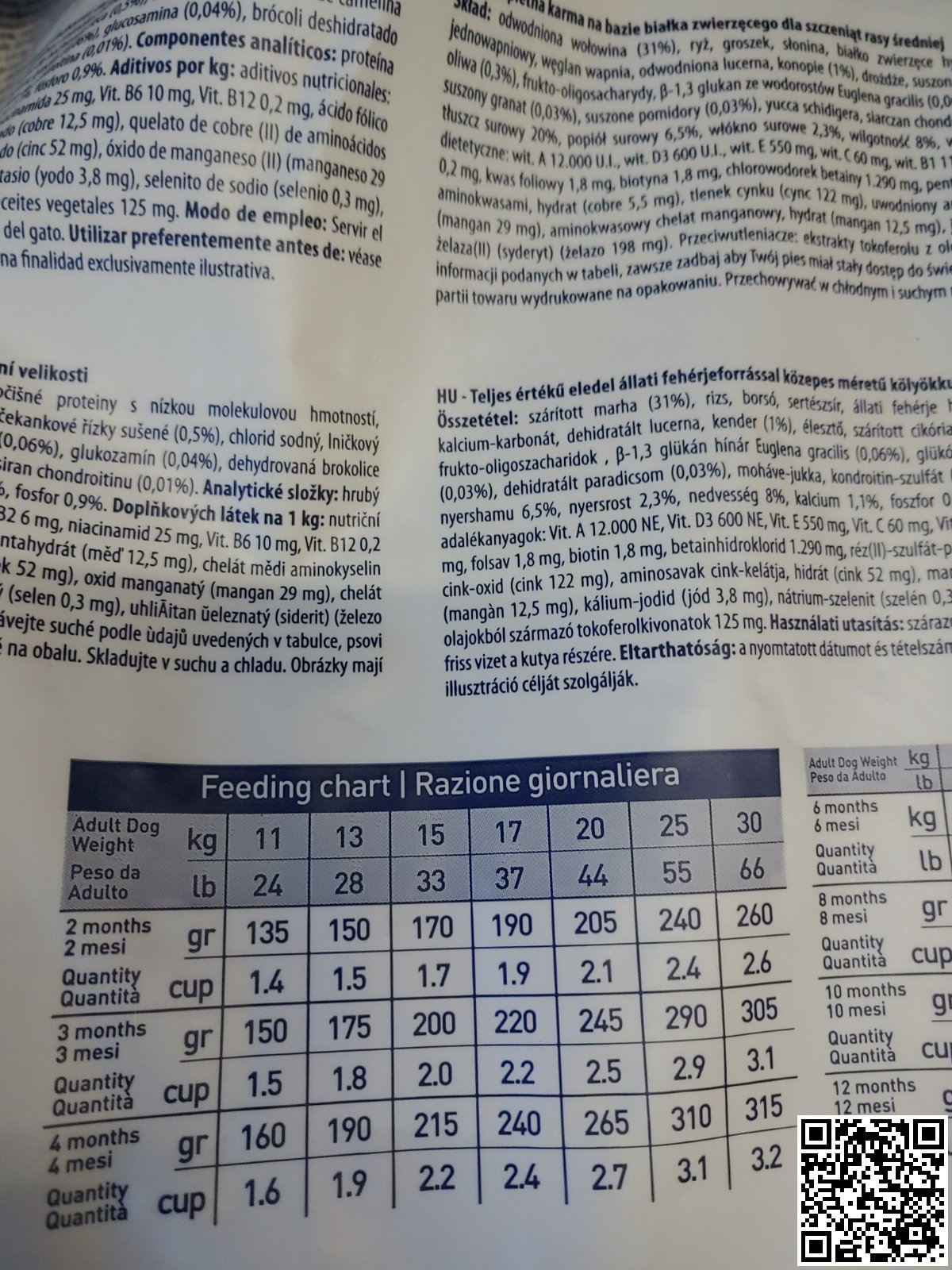 вітамін А – 12.000 МО, вітамін D3 – 600 МО, вітамін Е – 550 мг, вітамін С – 60 мг, вітамін В1 – 11 мг, вітамін В2 – 6 мг, вітамін В3 – 25 мг, вітамін В6 – 10 мг, вітамін В12 – 0,2 мг, фолієва кислота – 1,8 мг, вітамін Н – 1,8 мг, бетаїн – 1,290 мг, мідь (хелат міді гідрат амінокислот) – 5,5 мг, мідь (сульфат міді пенгідрат) – 12,5 мг, цинк (хелат цинку гідрат амінокислот) – 52 мг, цинк (оксид цинку) – 122 мг, марганець (хелат марганцю гідрат амінокислот) – 12,5 мг, марганець (оксид марганцю) – 29 мг, йод (калію йодид) – 3,8 мг, селеніт натрію (селен) – 0,3 мг, залізо (карбонат заліза) – 198 мг