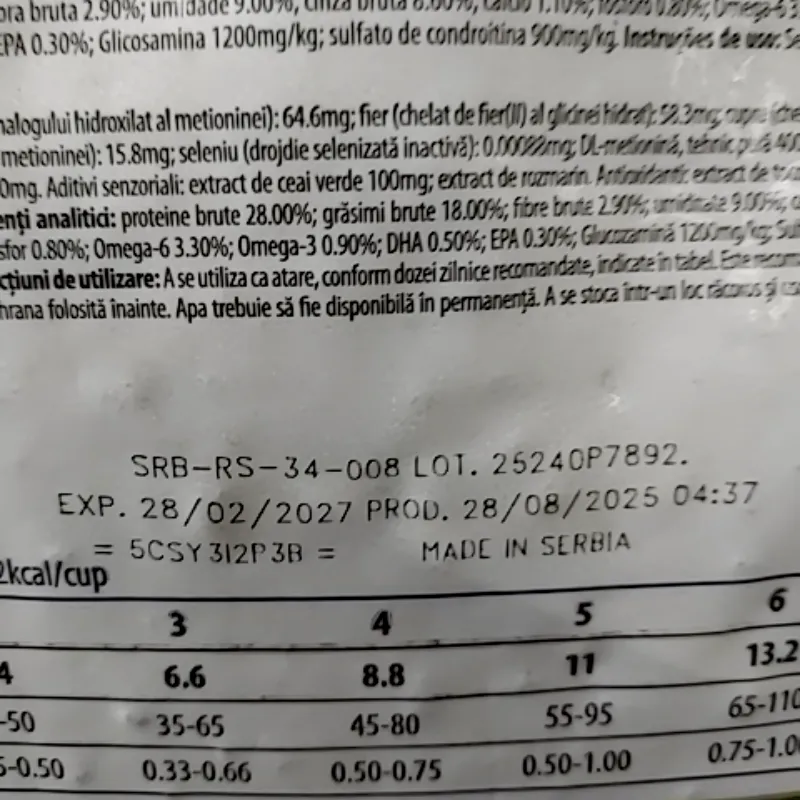 Сирий білок - 28%; сирі жири - 18%; сира клітковина - 2,90%; сира зола - 8,60%; кальцій - 1,40%; фосфор - 1,10%; Омега-6 - 3,30%; Омега-3 - 0,90%; DHA - 0,50%; EPA 0,30%; глюкозамін - 1200мг/кг; хондроїтин - 900мг/кг.