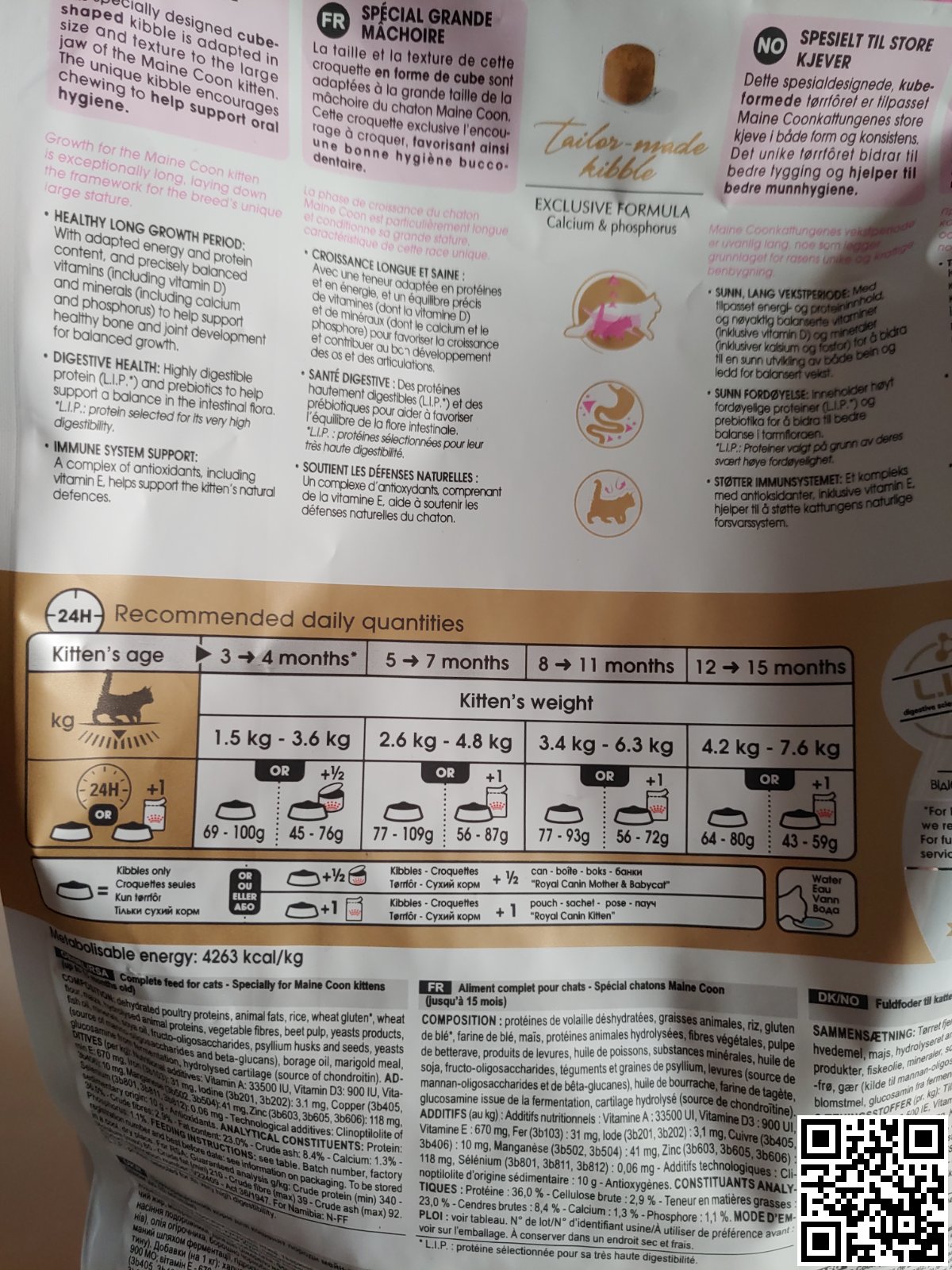 Спеціально розроблена крокета Royal Canin Maine Coon Kitten у формі куба адаптована за формою і текстурою до великих щелеп кошеняти породи Мейнкун. Унікальна форма крокети стимулює розгризання, допомагаючи підтримувати гігієну ротової порожнини. Ексклюзивна формула містить кальцій та фосфор.