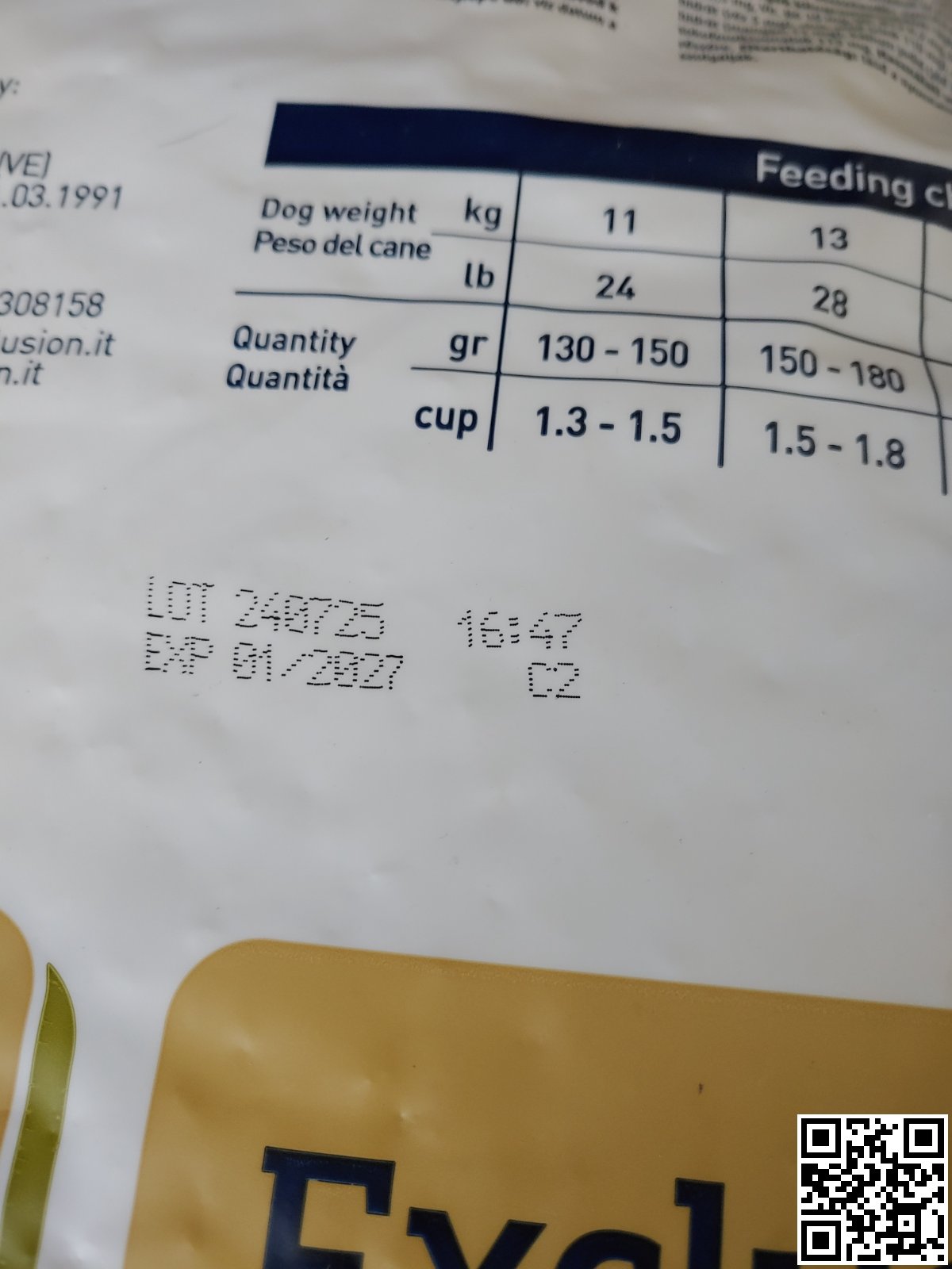 Фото строків придатності Exclusion Adult Lamb Medium Breed 12 кг |  Корм для дорослих собак середніх порід з ягням, зроблене 2025-11-25 Спожити до