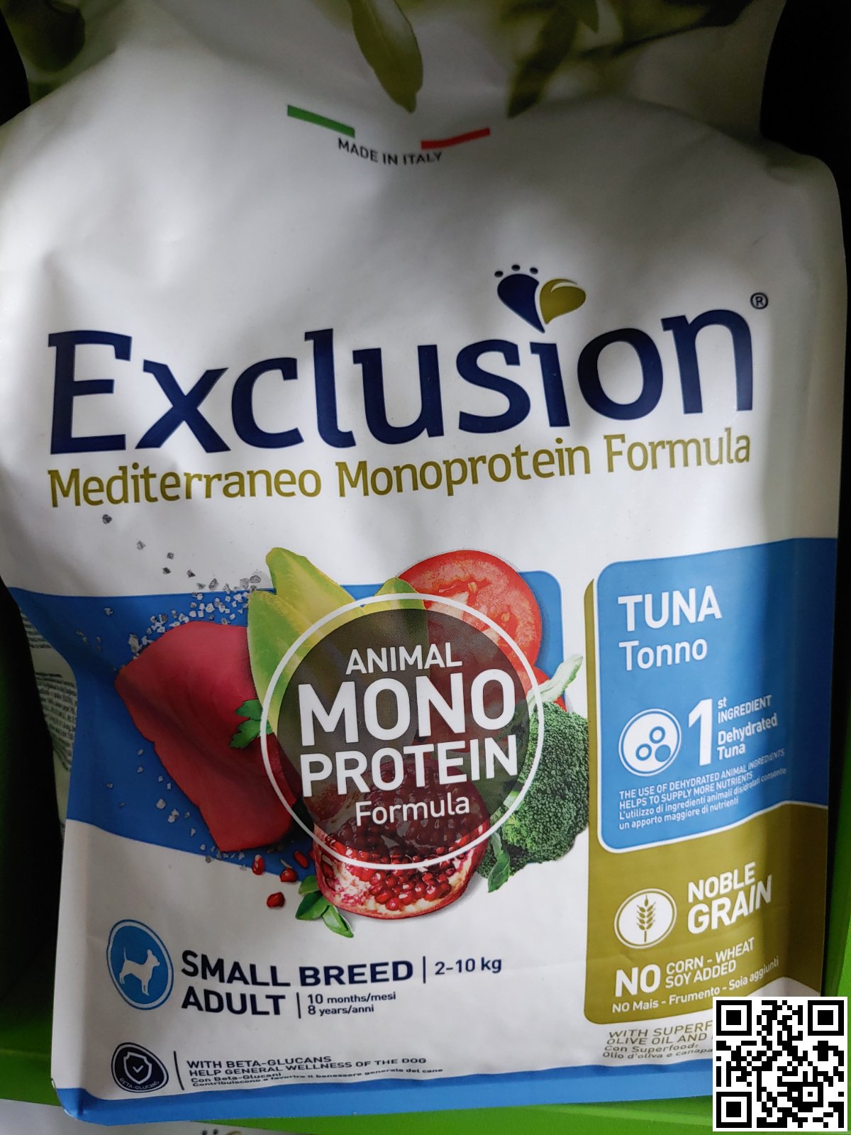 Exclusion Mediterraneo Monoprotein Formula – повнораціонний збалансований корм на основі високоякісного зерна та дегідрованого монопротеїну тваринного походження. Містить тільки натуральні антиоксиданти та β-глюкани. Рецептура корму розроблена в кращих середземноморських традиціях та включає в себе коноплі, оливкову олію, помідори, гранат, броколі та цикорій.