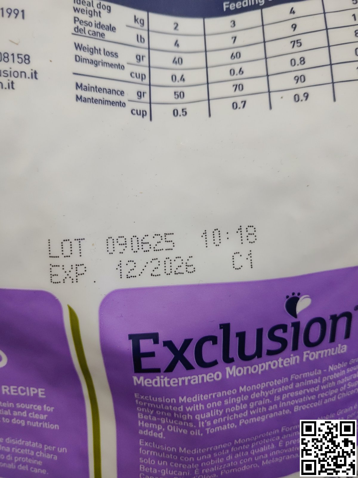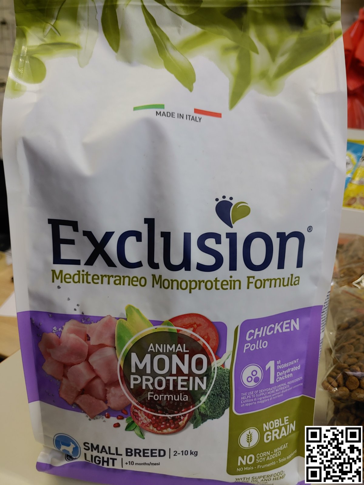 Фото строків придатності Exclusion Light Chicken Small Breed 2 кг | Сухий корм для дорослих собак дрібних порід з надмірною вагою з куркою, зроблене 2025-11-26 place Спожити до