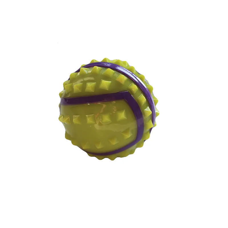 • Ефективне чищення зубів: Спеціальне розташування м'яких шипів та западин на поверхні м'яча дозволяє ефективно видаляти зубний наліт та залишки їжі навіть у важкодоступних місцях.
