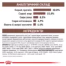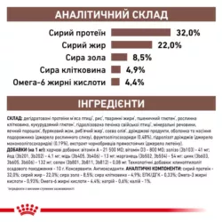 ІНГРЕДІЄНТИ: дегідратовані протеїни м’яса птиці*, рис*, тваринні жири*, пшеничний глютен*, рослинна клітковина, кукурудзяний глютен*, гідролізована печінка свiйської птицi*, мінеральні речовини, яєчний порошок*, буряковий жом, риб’ячий жир*, соєва олія*, дріжджові продукти, оболонка та насіння подорожника (джерела рослинного слизу), фруктоолiгосахариди (0,48%), гідролізат дріжджів (джерело мананоолігосахаридів) (0,19%), екстракт чорнобривців прямостоячих (джерело лютеїну). * Інгредієнти з високим ступенем засвоюваності
