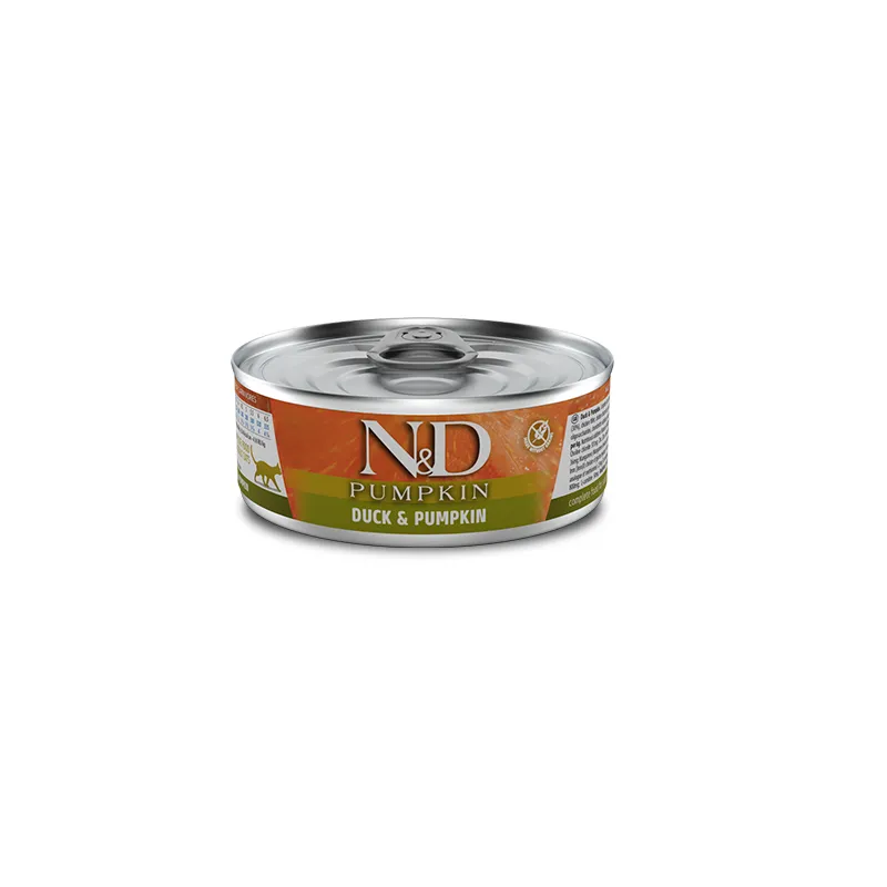 Farmina N&D Pumpkin Duck Adult – це повноцінний беззерновий вологий корм для дорослих котів. Раціон створений на основі філе качки, корисного гарбуза та інших добірних інгредієнтів. Завдяки унікальній технології приготування на парі, корм зберігає максимум поживних речовин та має неперевершений смак, який задовольнить навіть найвибагливіших котів.