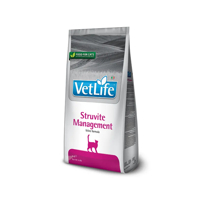 Farmina Vet Life Struvite Management – це повнораціонне дієтичне харчування, розроблене для дорослих котів, що страждають від сечокам'яної хвороби (струвітного типу) та ідіопатичного циститу. Ця формула допомагає розчиняти існуючі струвітні кристали та камені, а також запобігає їх повторному утворенню завдяки властивостям, що підкислюють сечу.