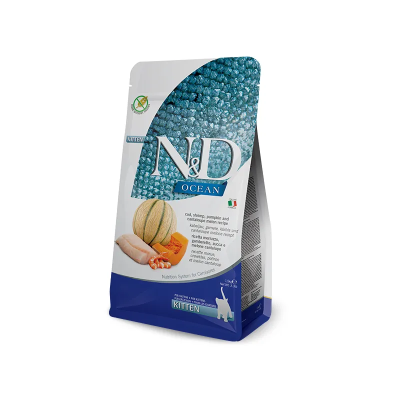 Farmina N&D Ocean з тріскою, креветками, гарбузом та динею - це повноцінне харчування для кошенят, а також вагітних та годуючих кішок. Високий вміст білка (44%) забезпечує енергією, а відсутність злаків і низький глікемічний індекс піклуються про чутливе травлення.