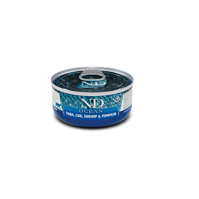 Farmina N&D Ocean Tuna, Cod, Shrimp & Pumpkin – це повнораціонний беззерновий вологий корм для дорослих котів, що поєднує в собі найкращі дари моря та користь гарбуза. Цей смачний та поживний раціон забезпечить вашого кота всім необхідним для здорового життя.