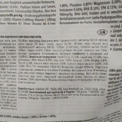 Сирий білок 33,00%; сирі жири та олії 21,5%; сира клітковина 1,90%; сира зола 7,90%; кальцій 1,00%; фосфор 0,80%; магній 0,08%; Омега-6 3,30%; Омега-3 0,60%.