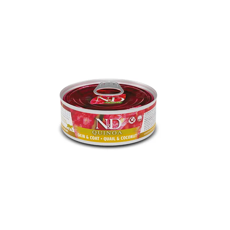 Farmina N&D Quinoa Skin & Coat - Quail & Coconut – це повнораціонний дієтичний вологий корм для дорослих котів, рекомендований для зниження непереносимості інгредієнтів та поживних речовин. Цей раціон є ідеальним вибором для котів з дерматологічними проблемами, алергіями або просто для підтримки краси шерсті.