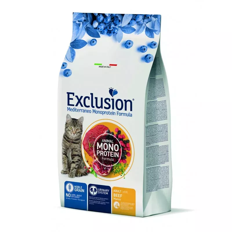 Exclusion Mediterraneo Monoprotein Formula – повнораціонний збалансований корм на основі високоякісного зерна та дегідрованого монопротеїну тваринного походження. Спеціально розроблена формула містить тільки натуральні антиоксиданти та забезпечує здоров’я сечовидільної системи. Корм створений в кращих середземноморських традиціях та включає в себе гранат, ожину, малину та чорницю. Рецептура збагачена псиліумом, який перешкоджає утворенню грудочок шерсті у травному тракті.