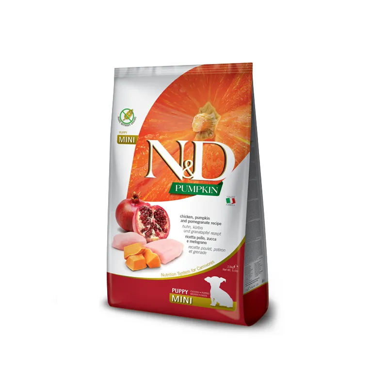 N&D Grain Free Pumpkin Chicken & Pomegranate Puppy Mini – це ексклюзивна беззернова формула, розроблена для забезпечення повноцінного та здорового харчування цуценят дрібних порід. Складаючись з високоякісного м'яса, овочів та фруктів, цей корм надає всі необхідні поживні речовини для гармонійного росту та розвитку вашого маленького улюбленця.