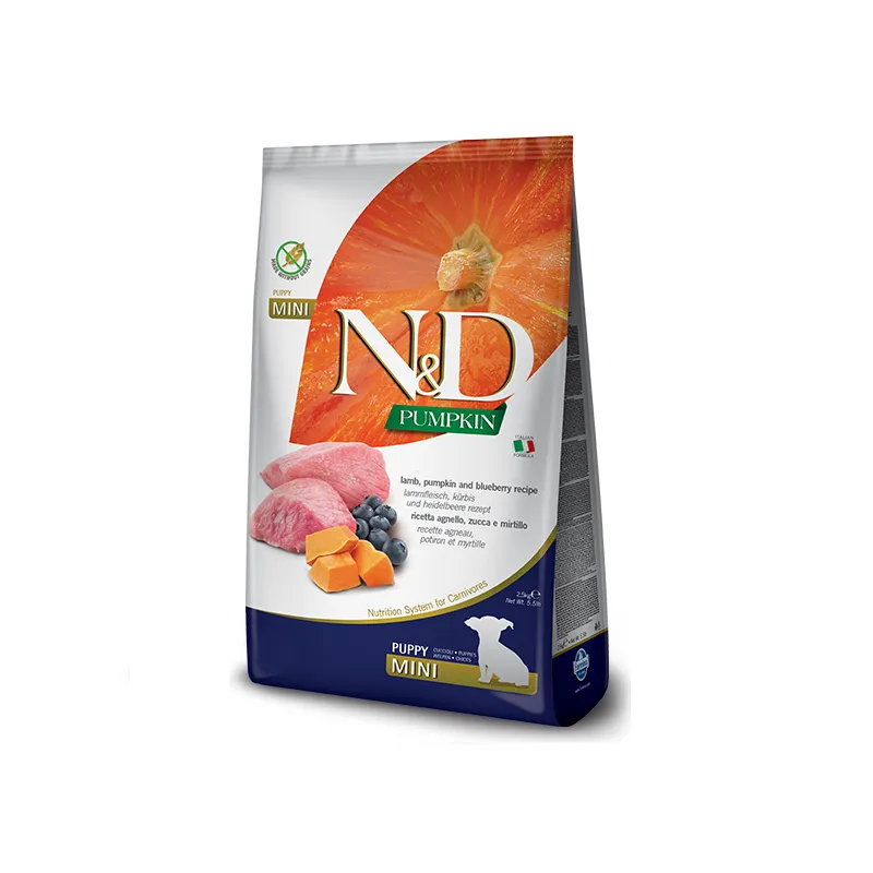 N&D Grain Free Pumpkin Puppy Mini Lamb and Blueberry – це повноцінний беззерновий сухий корм для цуценят дрібних порід, а також для вагітних та годуючих сук. Його формула на основі м'яса ягняти ідеально підходить для тварин, схильних до харчової алергії та з чутливим травленням.