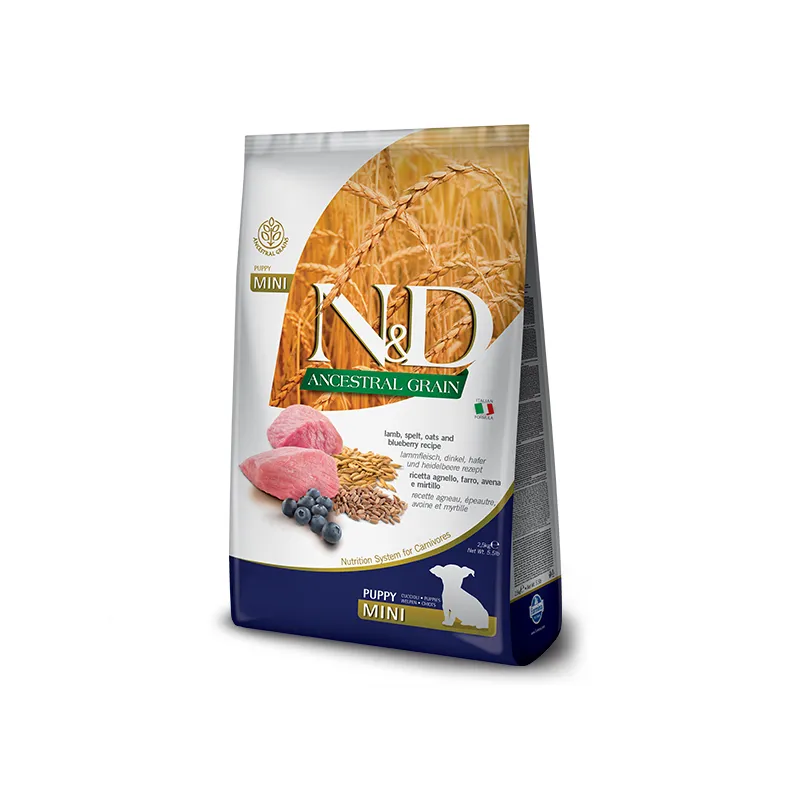Farmina N&D Low Grain Dog Lamb & Blueberry Puppy Mini – це повноцінний низькозерновий сухий корм, розроблений для цуценят дрібних порід, а також для вагітних та годуючих сук. Завдяки м'ясу ягняти, цей корм є чудовим вибором для тварин, схильних до алергій.