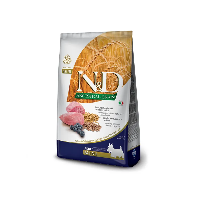 Farmina N&D Ancestral Grain Adult Mini Lamb and Blueberry – це повноцінний низькозерновий сухий корм, створений для дорослих собак дрібних порід. Його рецептура розроблена на основі природних потреб м'ясоїдних тварин, поєднуючи високоякісні тваринні білки, корисні фрукти та овочі, а також невелику кількість спадкових злаків.
