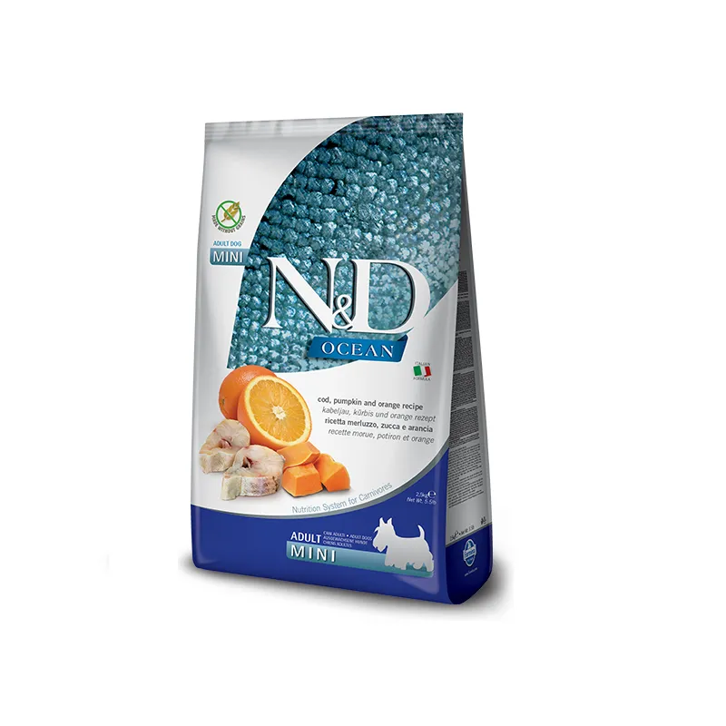 Farmina N&D Ocean Pumpkin Codfish & Orange – це повнораціонний беззерновий сухий корм для дорослих собак дрібних порід. Цей раціон поєднує користь морепродуктів з унікальними властивостями гарбуза, створюючи ідеальне харчування для вашого чотирилапого друга.
