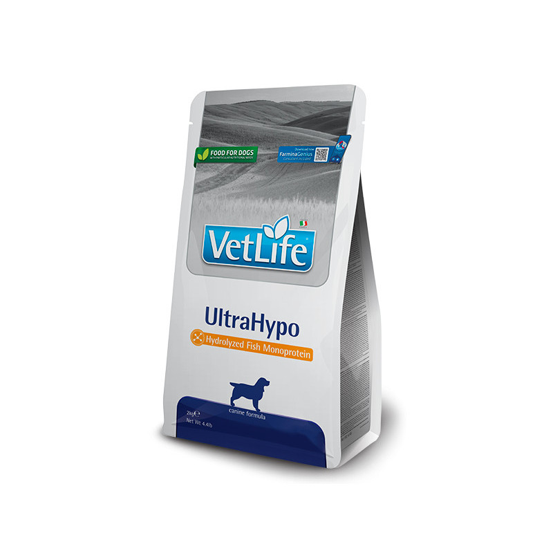 Farmina Vet Life UltraHypo – це повноцінне дієтичне харчування для собак, розроблене для боротьби з гострою харчовою непереносимістю. Це ідеальний інструмент для ветеринарного лікаря у вигляді елімінаційної дієти. Також корм рекомендований для підтримки здоров'я шкіри у випадках дерматозів та надмірної втрати шерсті.