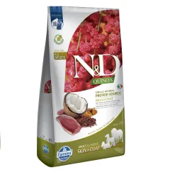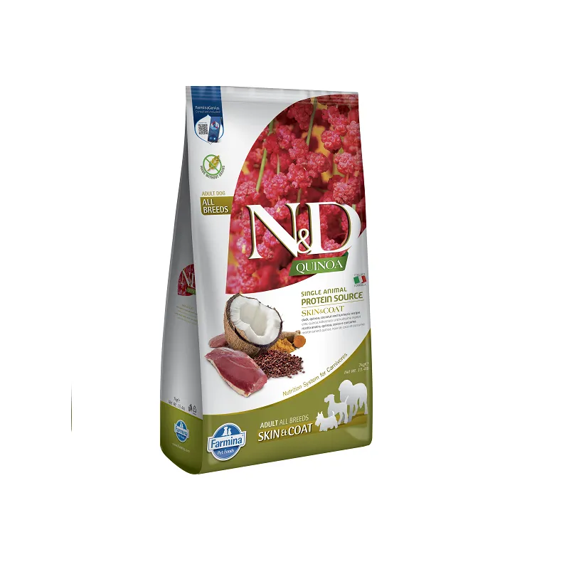 Farmina N&D Quinoa Skin & Coat Duck – це повнораціонний дієтичний сухий корм для дорослих собак середніх і великих порід, рекомендований при харчовій непереносимості та для підтримки здоров'я шкіри та шерсті. Ця беззернова формула з качкою, кіноа, кокосом та куркумою забезпечує збалансоване харчування та допомагає зменшити прояви алергічних реакцій.