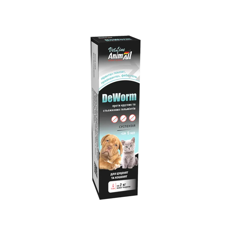 Суспензія AnimAll VetLine DeWorm — це комбінований антигельмінтний препарат, розроблений спеціально для безпечної та ефективної дегельмінтизації цуценят та кошенят.