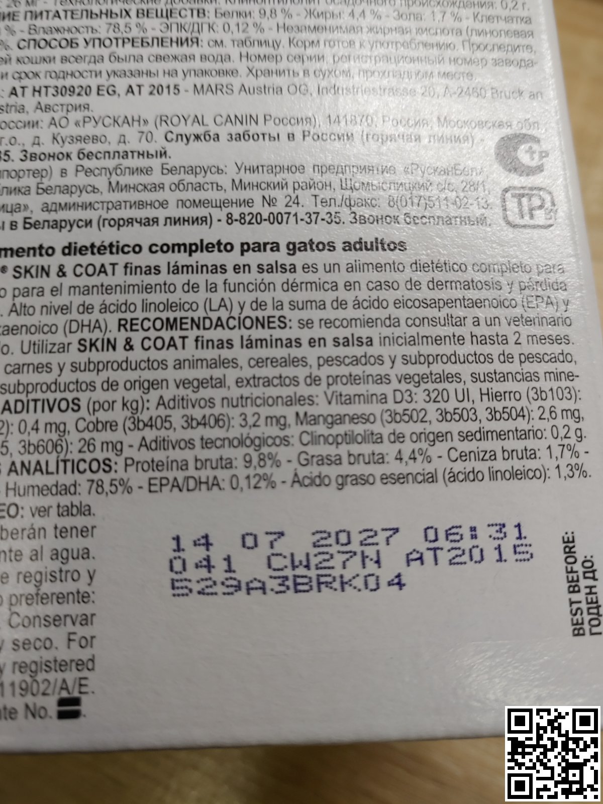 Фото строків придатності Skin And Coat Cat 0.085 кг | Royal Canin | Вологий Корм Для Кішок, зроблене 2025-11-25 Спожити до