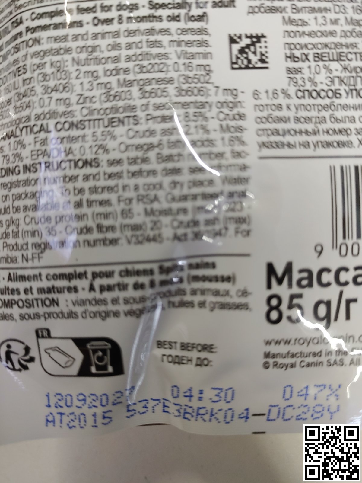 Фото строків придатності Royal Canin Pomeranian Adult Loaf 0.085 кг | Консервований Корм Для Собак Померанський Шпіц, зроблене 2025-11-28 place Спожити до